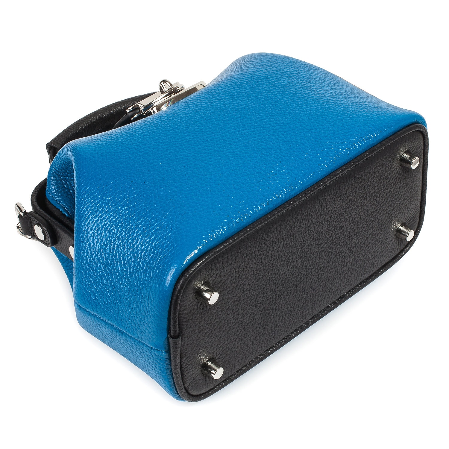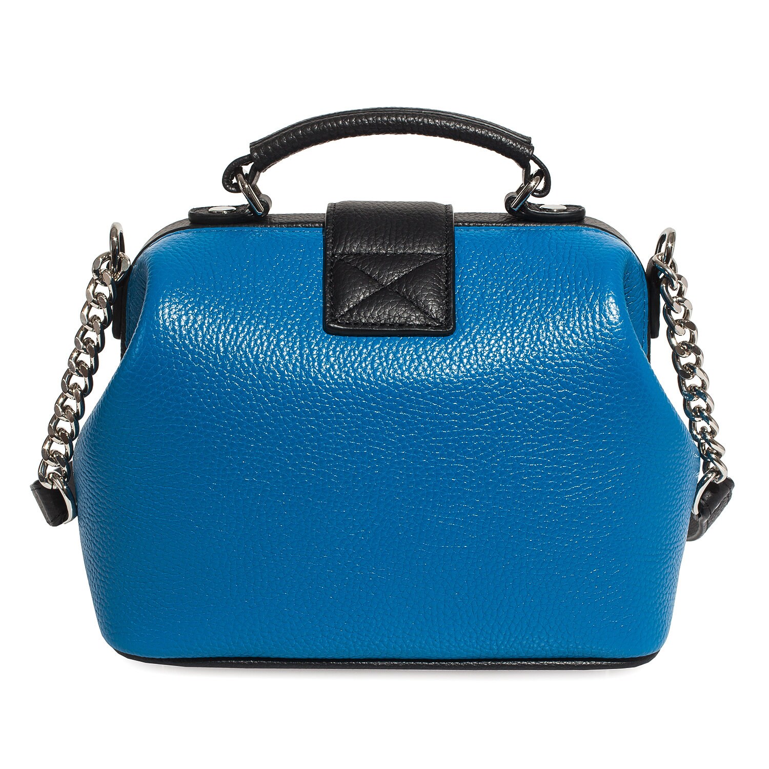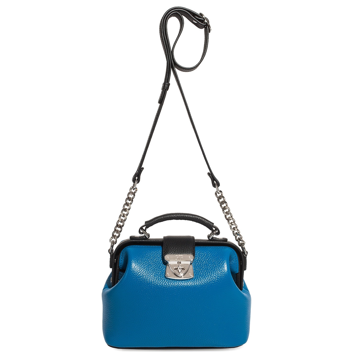 Women's leather doctor bag made of genuine leather, hardware with galvanic coating and microfiber lining. The internal space of a bag is equipped with one spacious compartment, one patch-pocket and one zipper pocket. The bag is closed with a clasp. The kit also includes a storage bag.