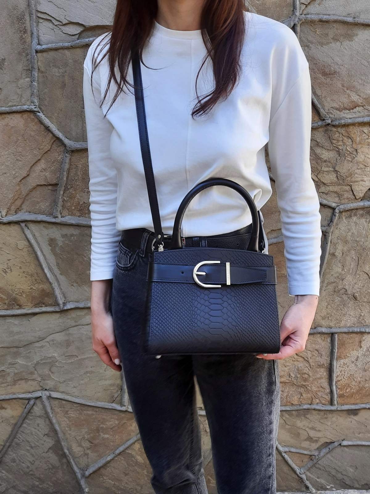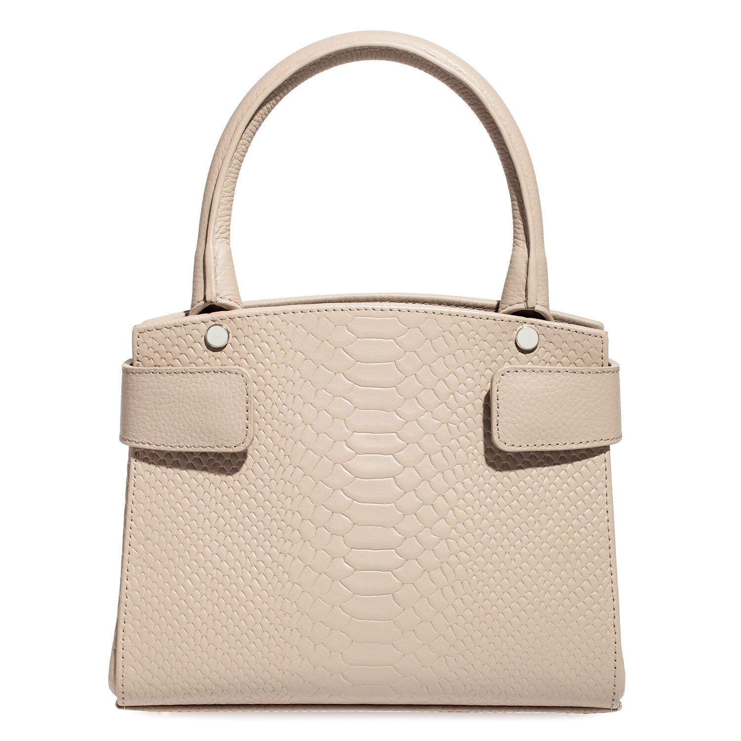 Women's leather bag made of genuine leather, hardware with galvanic coating and microfiber lining. The internal space of a bag is equipped with three compartments, one compartment and two side pockets, one with a zipper. §³loses with 3 magnet buttons. The bottom of the bag is protected with metal legs. There is a long handle that allows you to wear the bag on the shoulder. The kit also includes a storage bag.